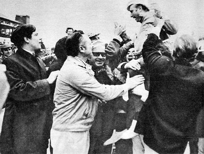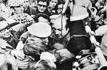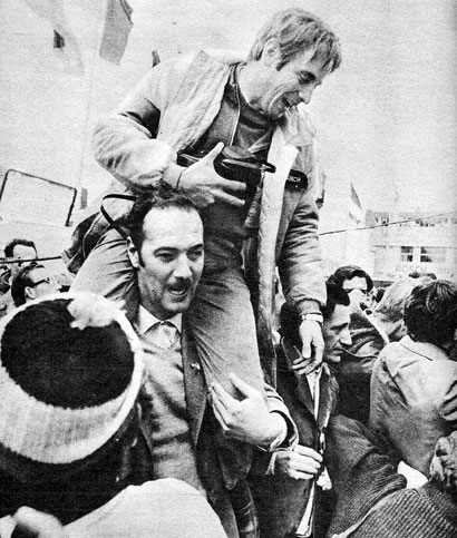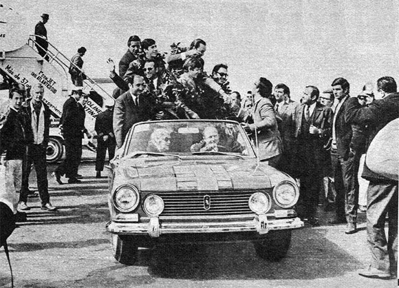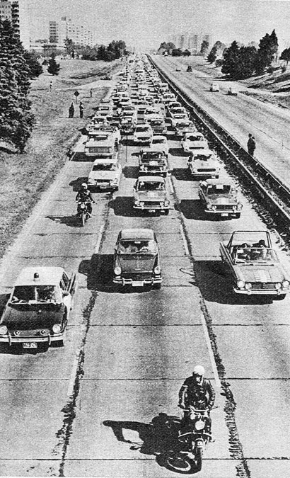 La autopista sirve de escenario para una de las más grandes demostraciones de afecto de nuestro pueblo. Una caravana interminable de coches sigue a los autos que tripulan los corredores. La misma llegaría a su punto más alto de emotividad en pleno centro de la ciudad con una acogida pocas veces vista. Foto Revista Automundo