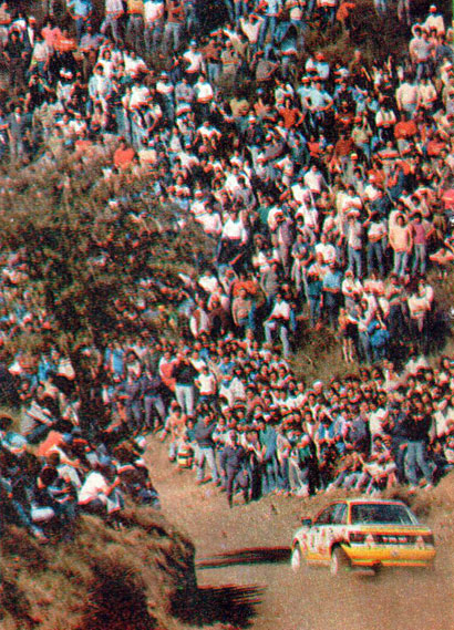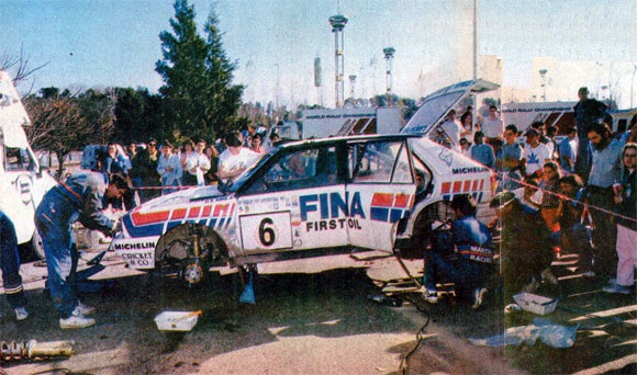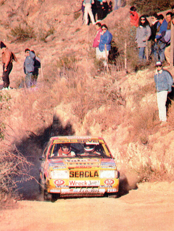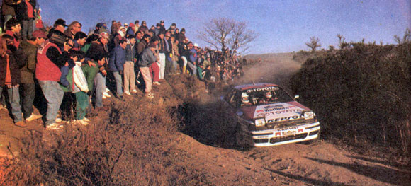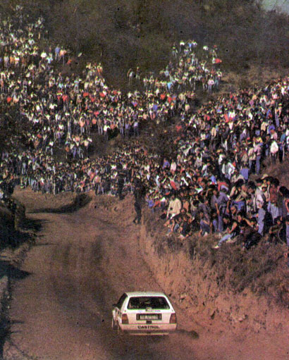 Menem - Zucchini en los primeros y problemáticos tramos serranos de la competencia. Buen marco de público. Foto Revista Corsa Fue una carrera sin igual. Poco imaginable en los pronósticos de los más expertos. Con la presencia de tres campeones del mundo (Biasion, Kankkunen y Sainz), con las dos marcas que pelean el campeonato y con un desarrollo muy rara vez visto en una prueba por el mundial de rally.
