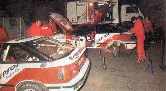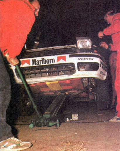 Cambio de suspensiones en el Lancia de Auriol, antes de ingresar al kartódromo. Entre prime y prime los autos eran reparados bastante a fondo